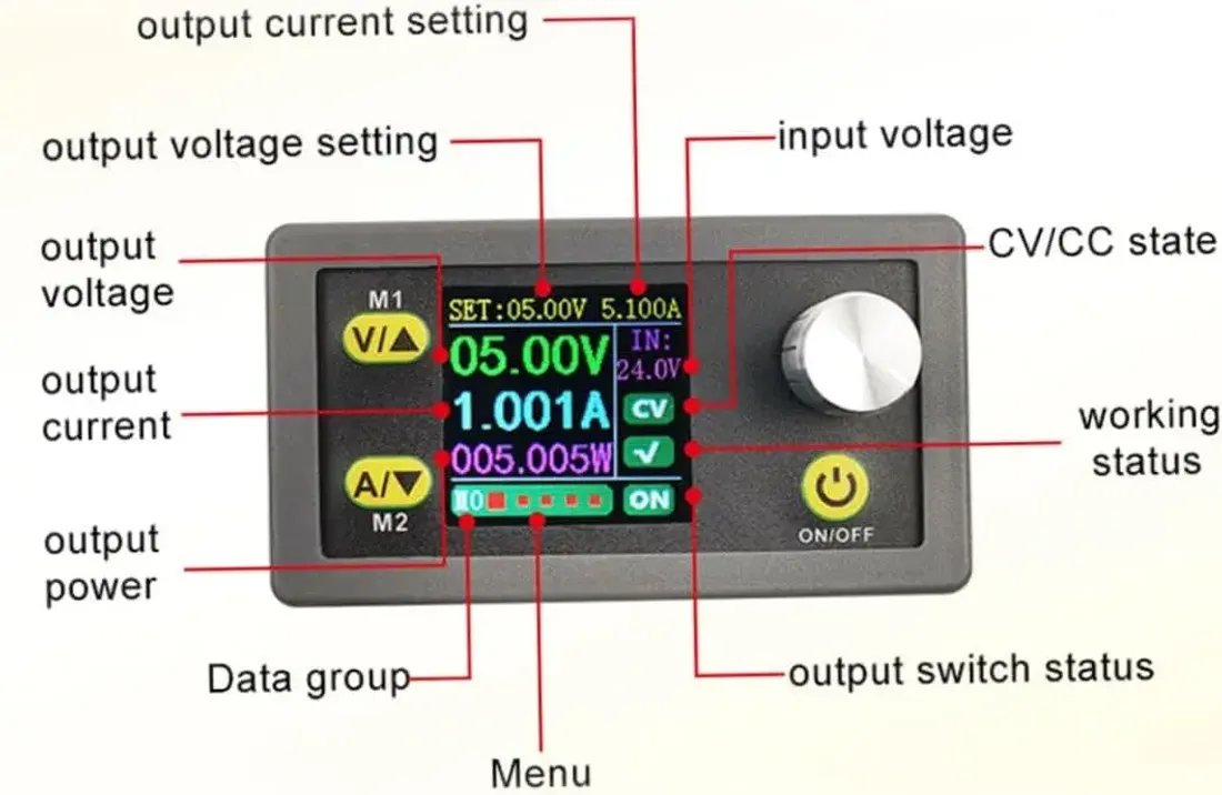 • Выход: 0.6–36V DC, 0–5.1A