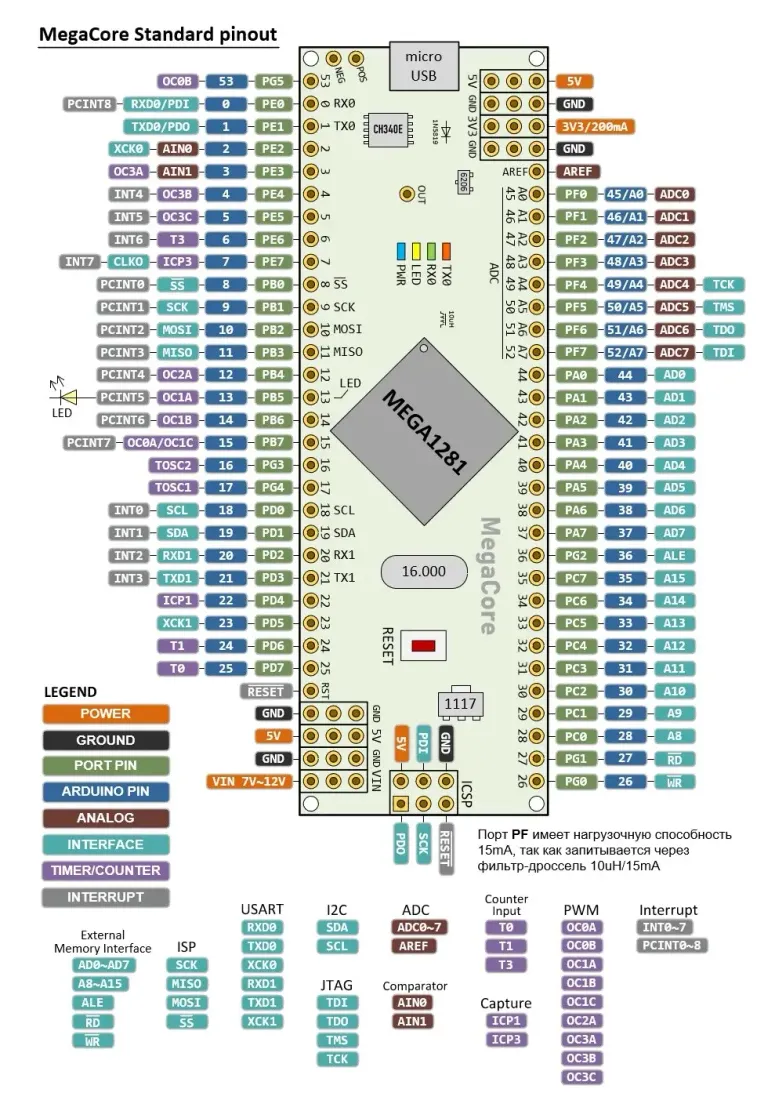 • Порты: всего 54 (цифровых 46, из них 9 ШИМ; аналоговых входов 8, 10 бит)