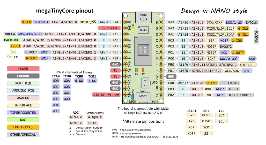 Отладочная плата Arduino NANO T3216 на ATtiny3216 (НОВАЯ ГЕНЕРАЦИЯ tinyAVR® 1-series)