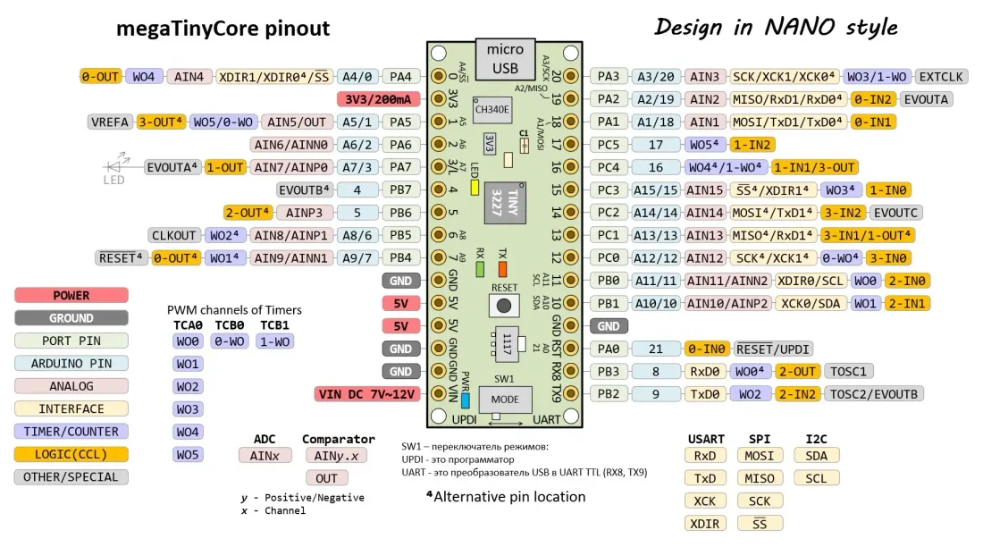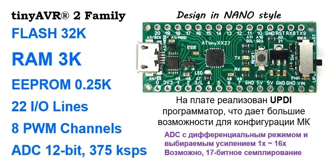 Отладочная плата Arduino NANO T3227 на ATtiny3227 (НОВАЯ ГЕНЕРАЦИЯ tinyAVR® 2 Family)